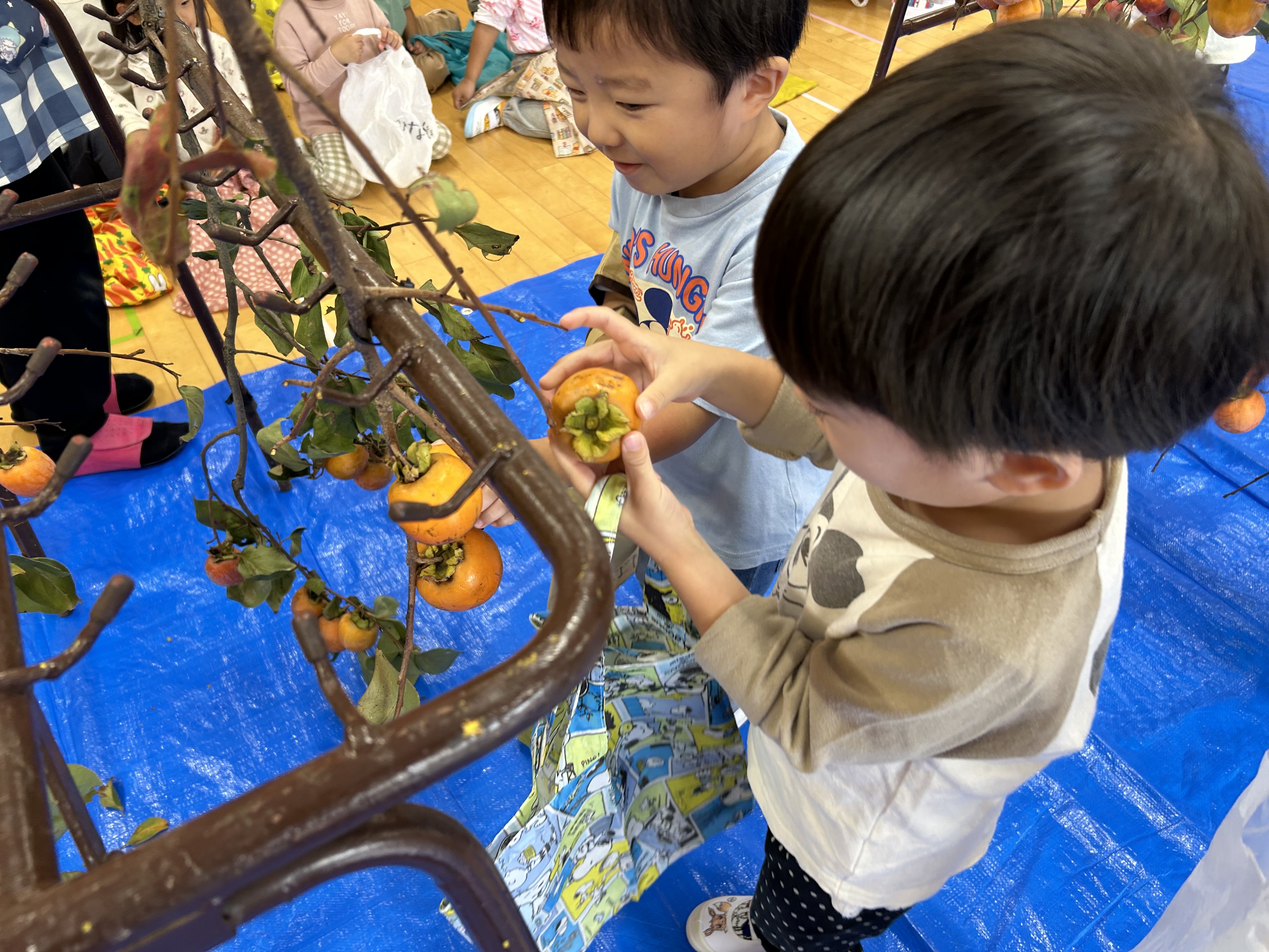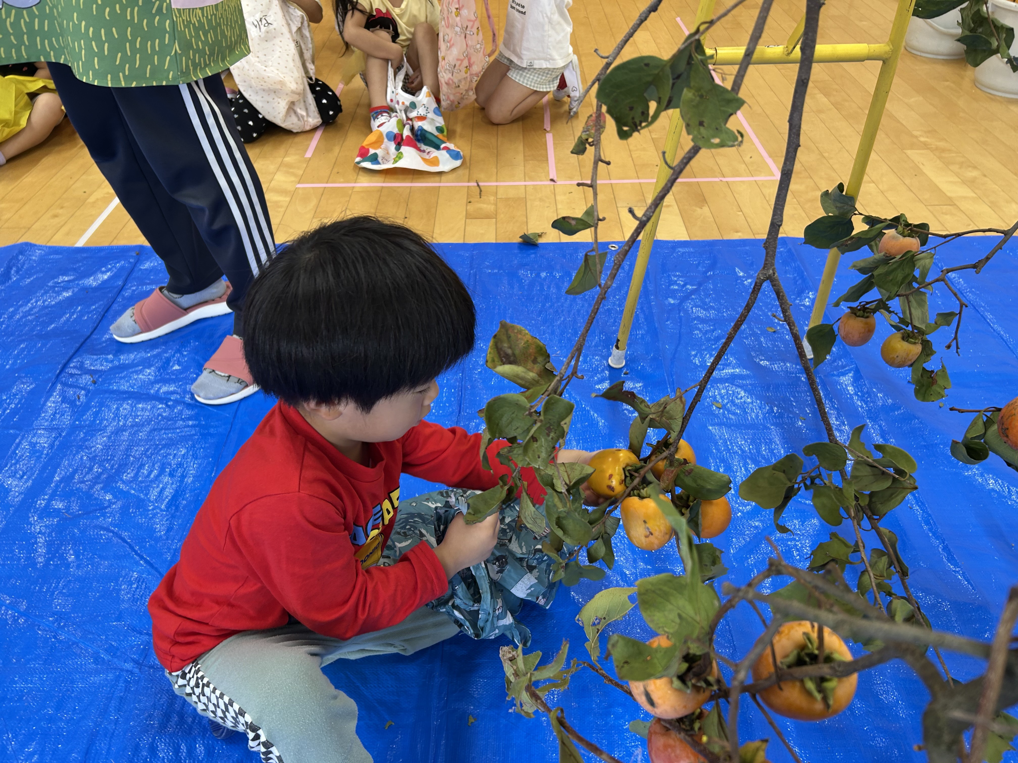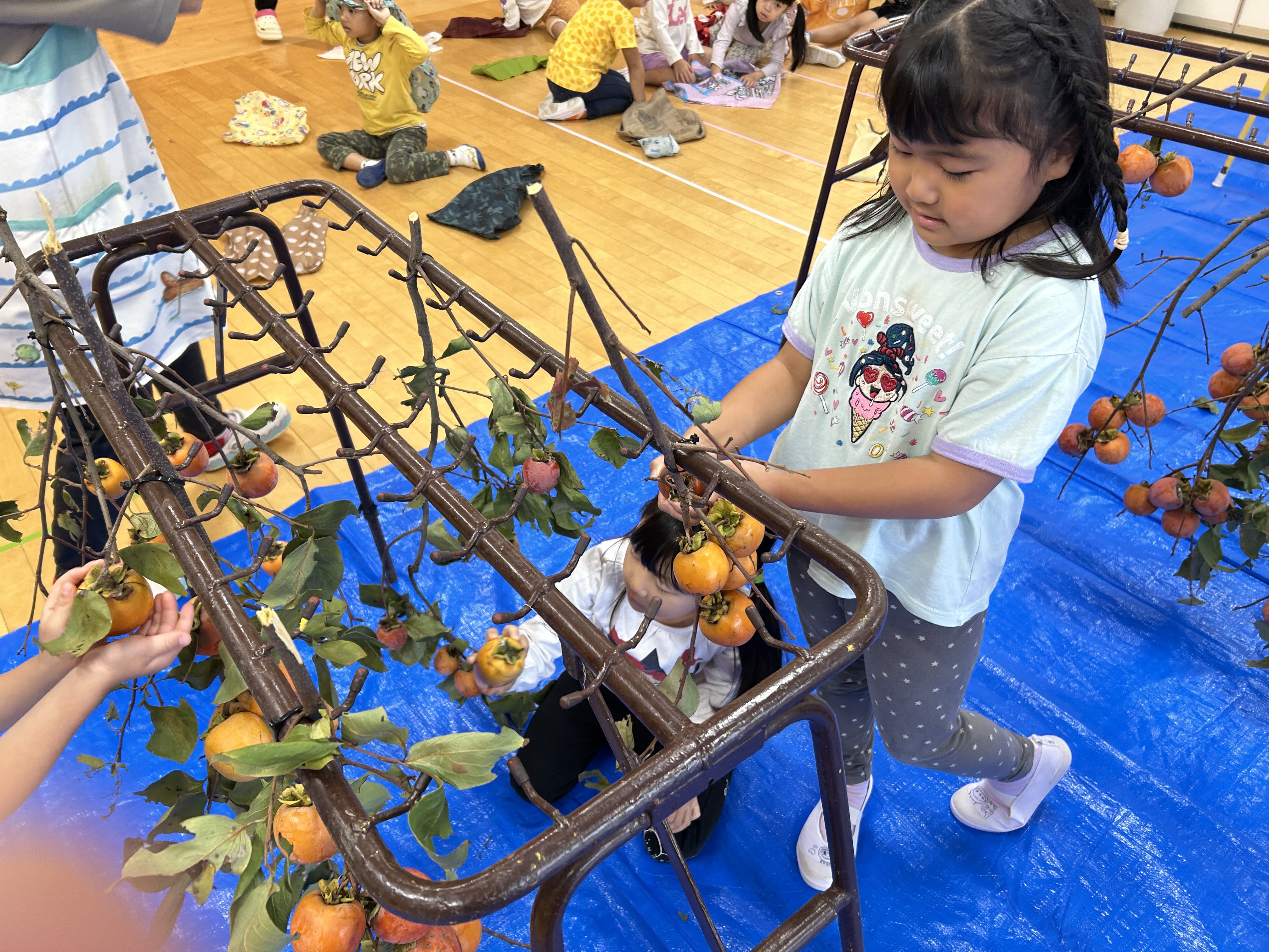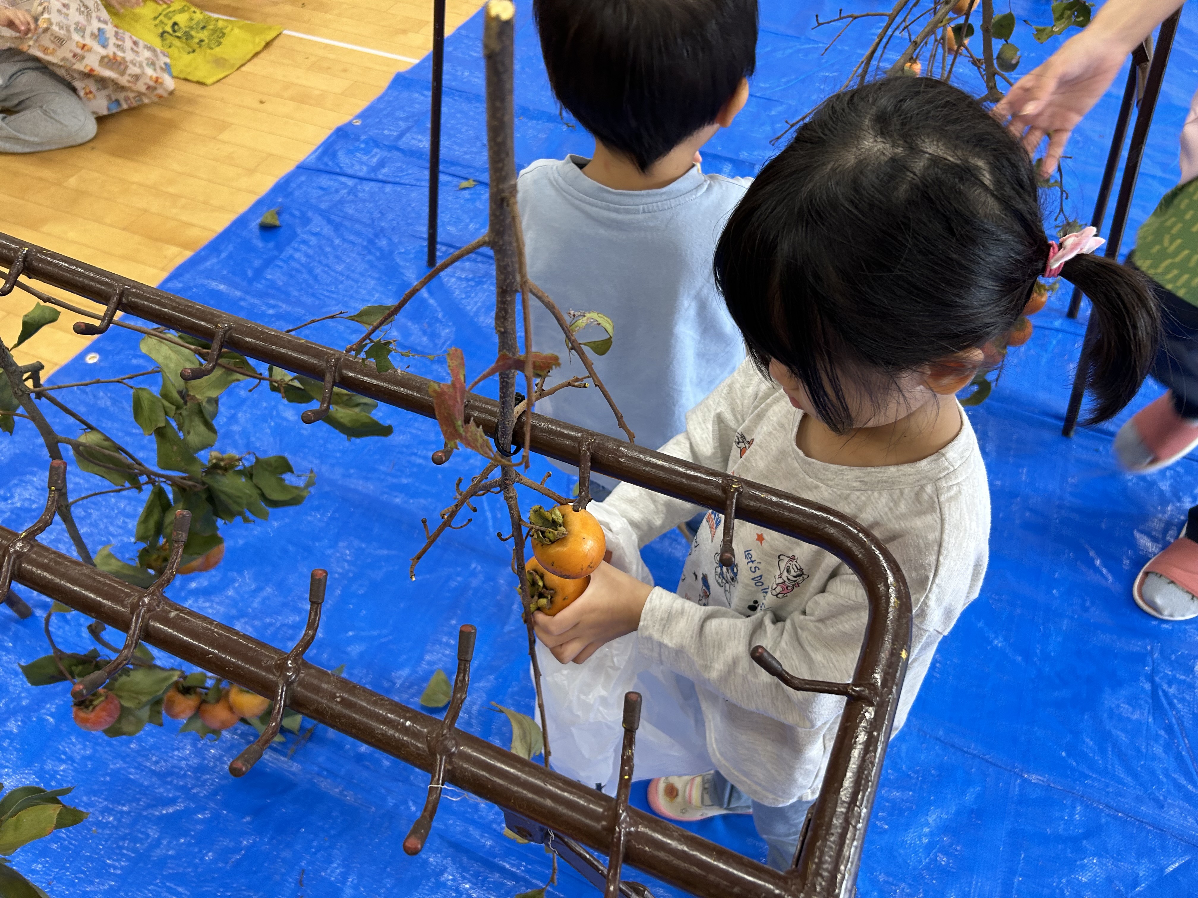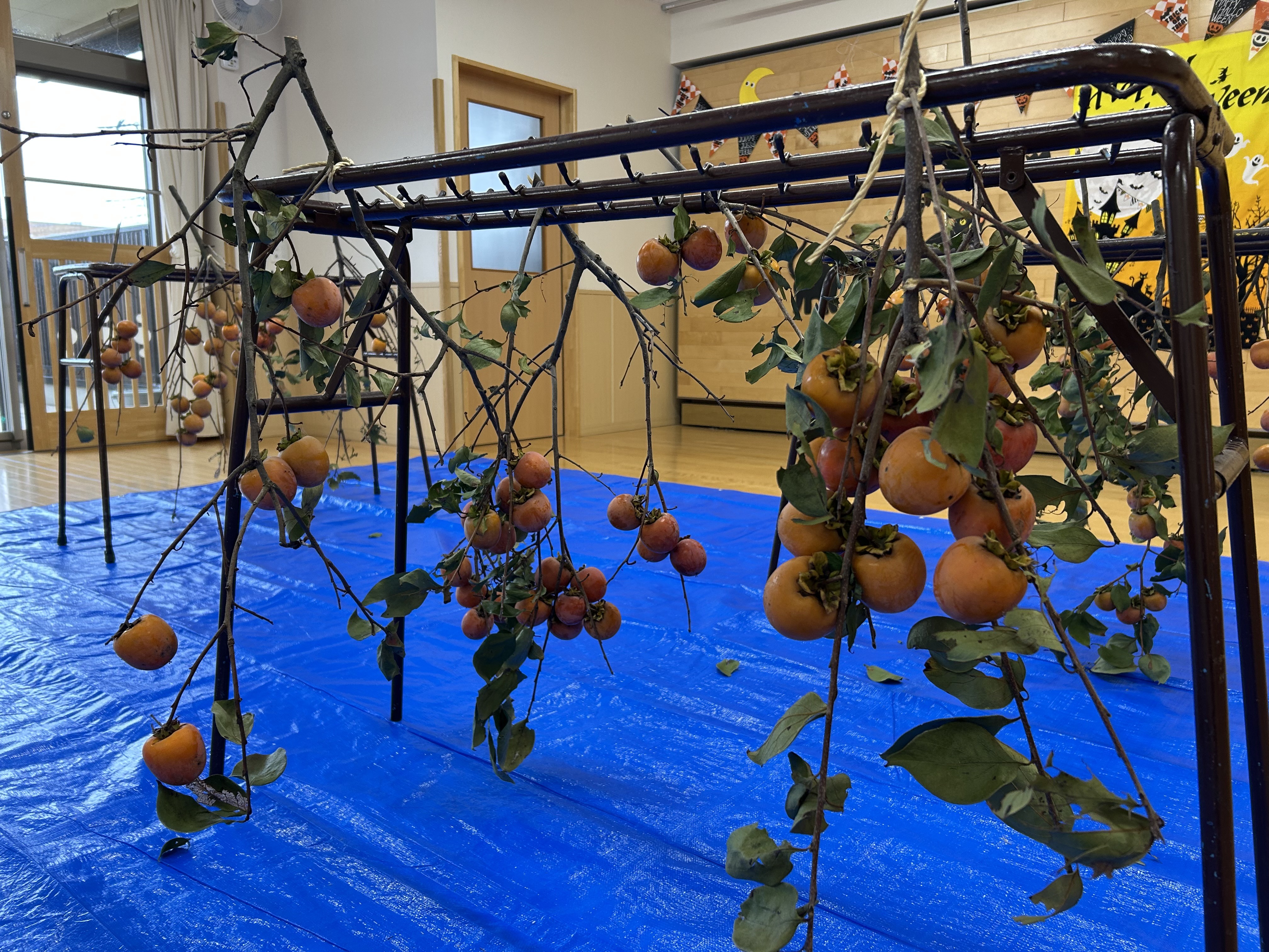 急遽、ホールでの柿とりとなりました。